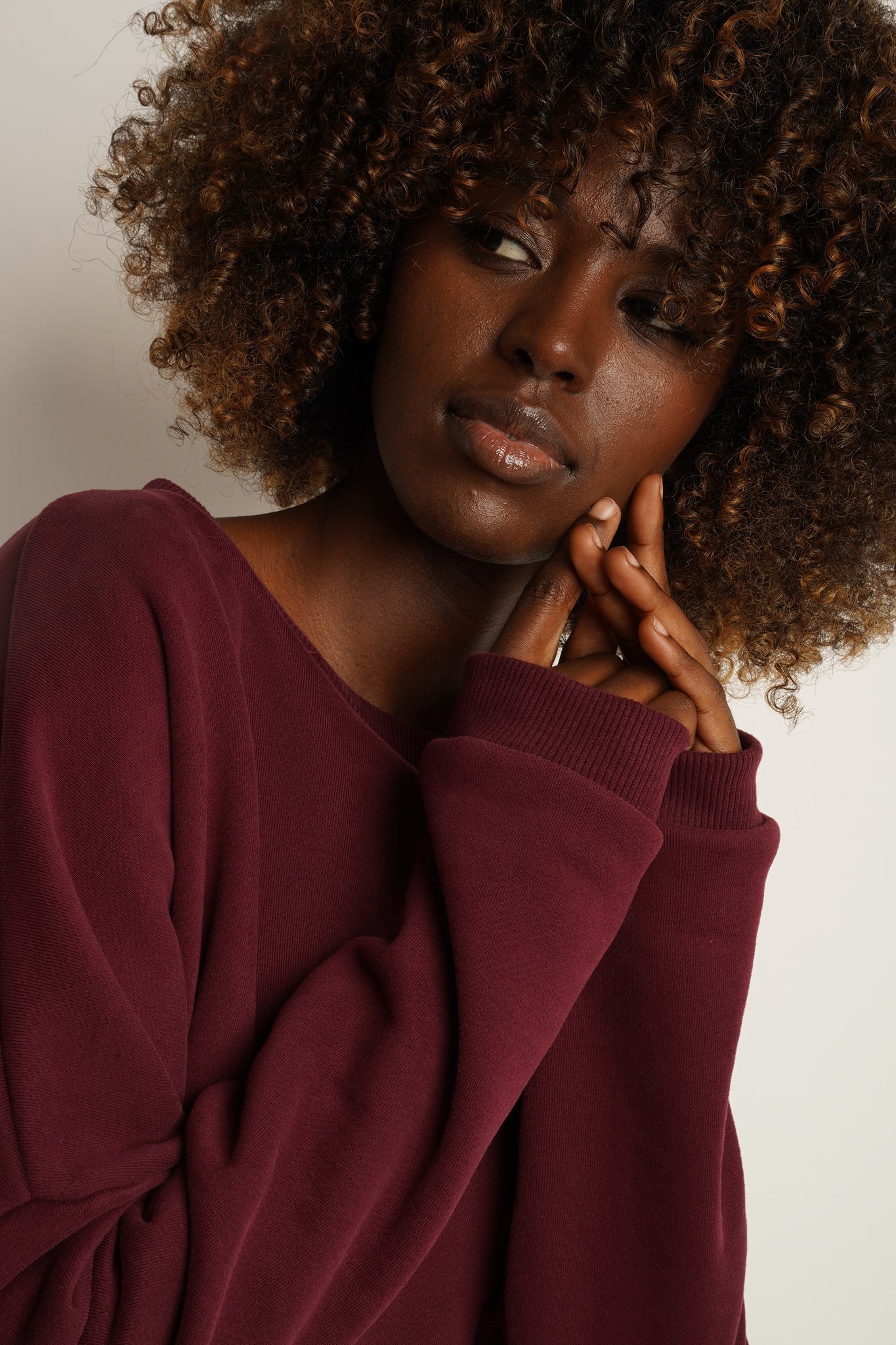 Bluza Cook ma szeroki fason, opuszczone luźne rękawy zakończone wąskim delikatnym ściągaczem. Dół bluzy jest asymetryczny – tył jest nieco dłuższy. Po bokach ma niewielkie rozporki. Na dole również są ściągacze, a z boku naszyta jest ozdobna naszywka wykonana ze skóry ekologicznej. Bluza świetnie wygląda założona do szerokich, jak i wąskich spodni. Może być także zestawiona z wąską spódnicą lub sukienką tubą – tworzy to wygodny i niezobowiązujący look. Bluza uszyta jest z naszej flagowej, grubej dzianiny, która nas wyróżnia. Jest ona gładka, ale przy tym bardzo mięsista. Od spodu posiada charakterystyczny splot diagonalny pokryty lekkim meszkiem, który w przyjemny sposób otula naszą skórę. Wierzchnia strona dzianiny także jest bardzo miła w dotyku, wykończona jest delikatnym meszkiem potocznie zwanym efektem brzoskwini, który nadaje jej wyjątkowej delikatności. Aby zachować ten efekt na dłużej i zredukować zjawisko mechacenia po praniu, w produkcji dzianiny zostały zastosowane specjalne enzymy, które świetnie spełniają swoją rolę. Naszą kolekcję w 90% opieramy właśnie na tej wyjątkowej dzianinie. Na koniec najważniejsza kwestia- zgodnie z ideą Mother Earth 10% składu dzianiny stanowi poliester uzyskany z recyklingu. Nasza modelka ma 167 cm. wzrostu i ma na sobie rozmiar M/L.