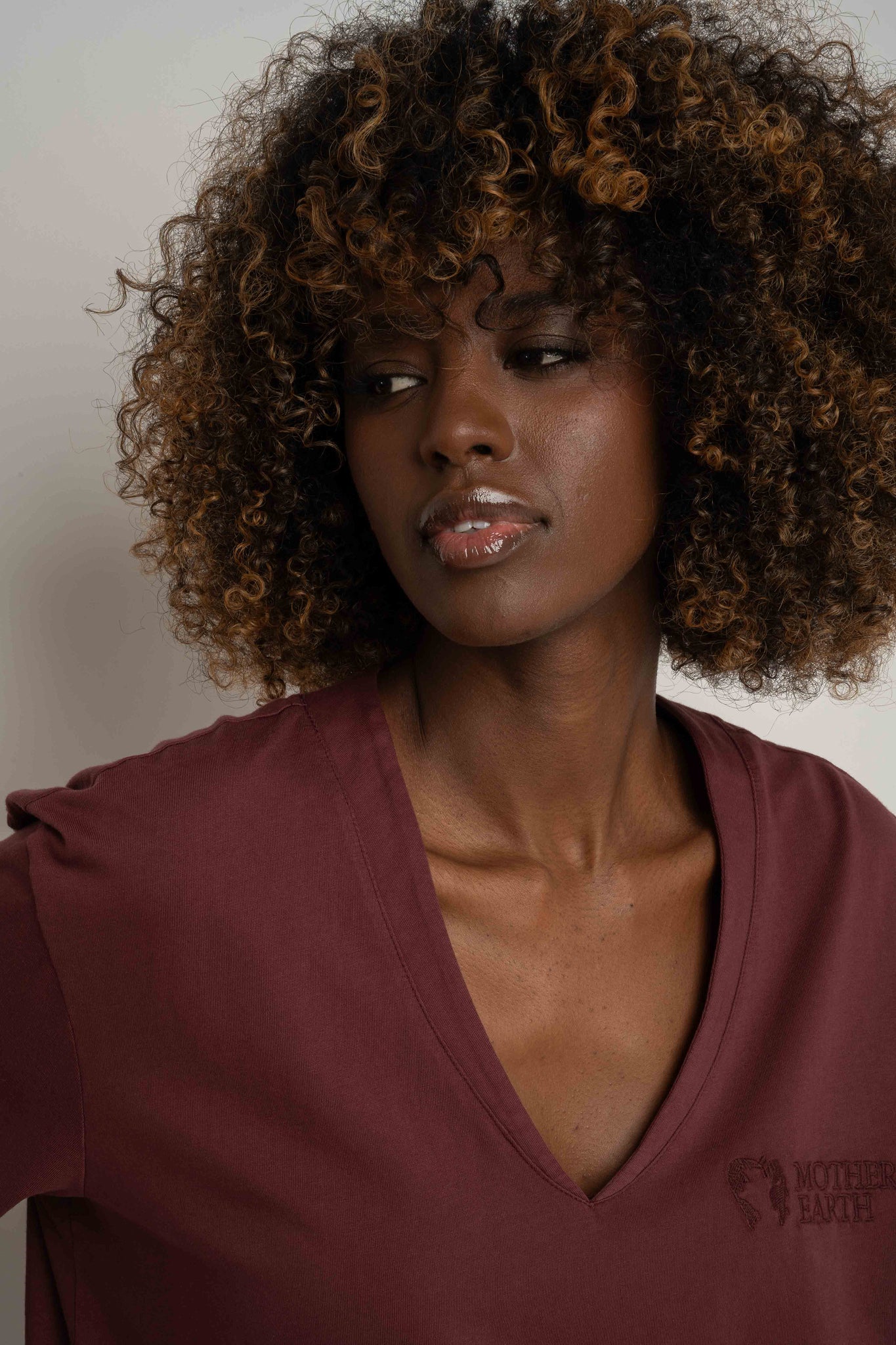 Klasyczny fason oversize w połączeniu z dekoltem w serek pięknie podkreśla sylwetkę, nadając koszulce nowoczesnego, kobiecego charakteru. Efekt delikatnego sprania subtelnie dodaje t-shirtowi lekko vintage’owego wyglądu, wciąż zachowując minimalistyczny i elegancki styl.