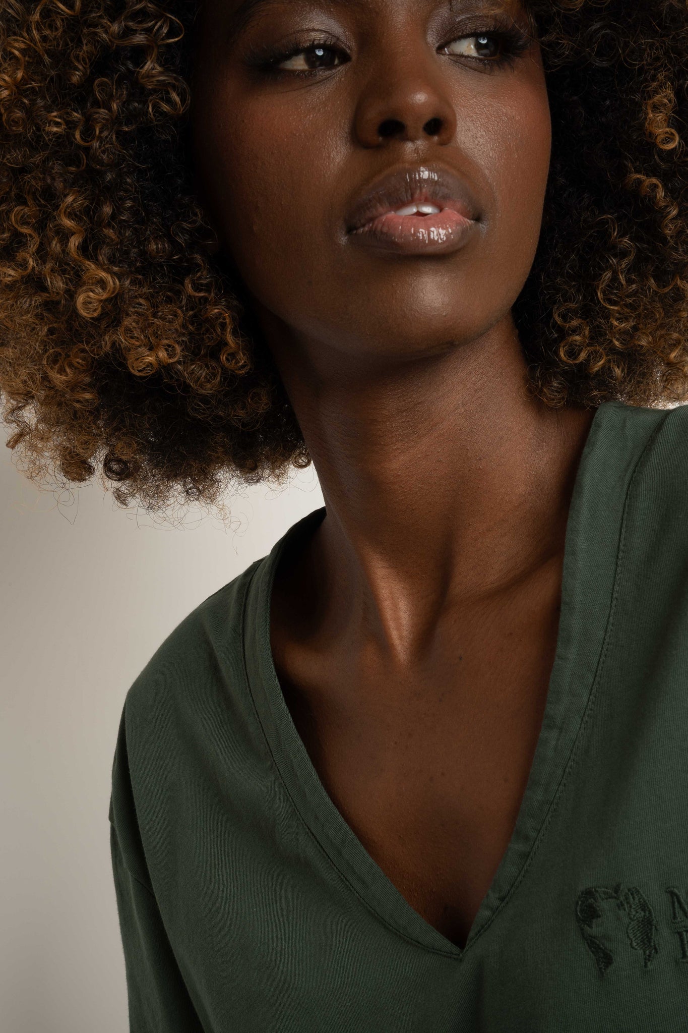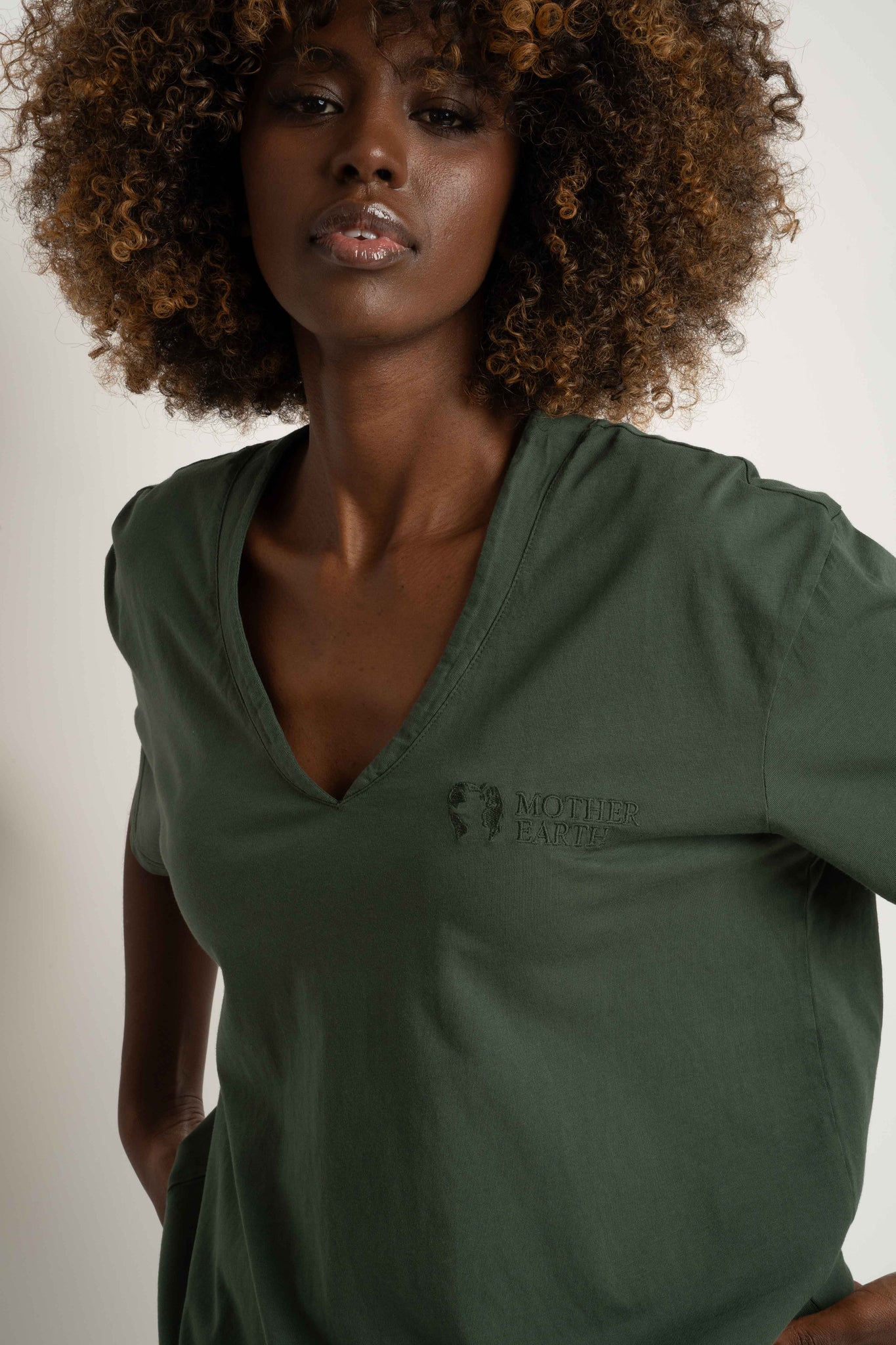 Klasyczny fason oversize w połączeniu z dekoltem w serek pięknie podkreśla sylwetkę, nadając koszulce nowoczesnego, kobiecego charakteru. Efekt delikatnego sprania subtelnie dodaje t-shirtowi lekko vintage’owego wyglądu, wciąż zachowując minimalistyczny i elegancki styl.