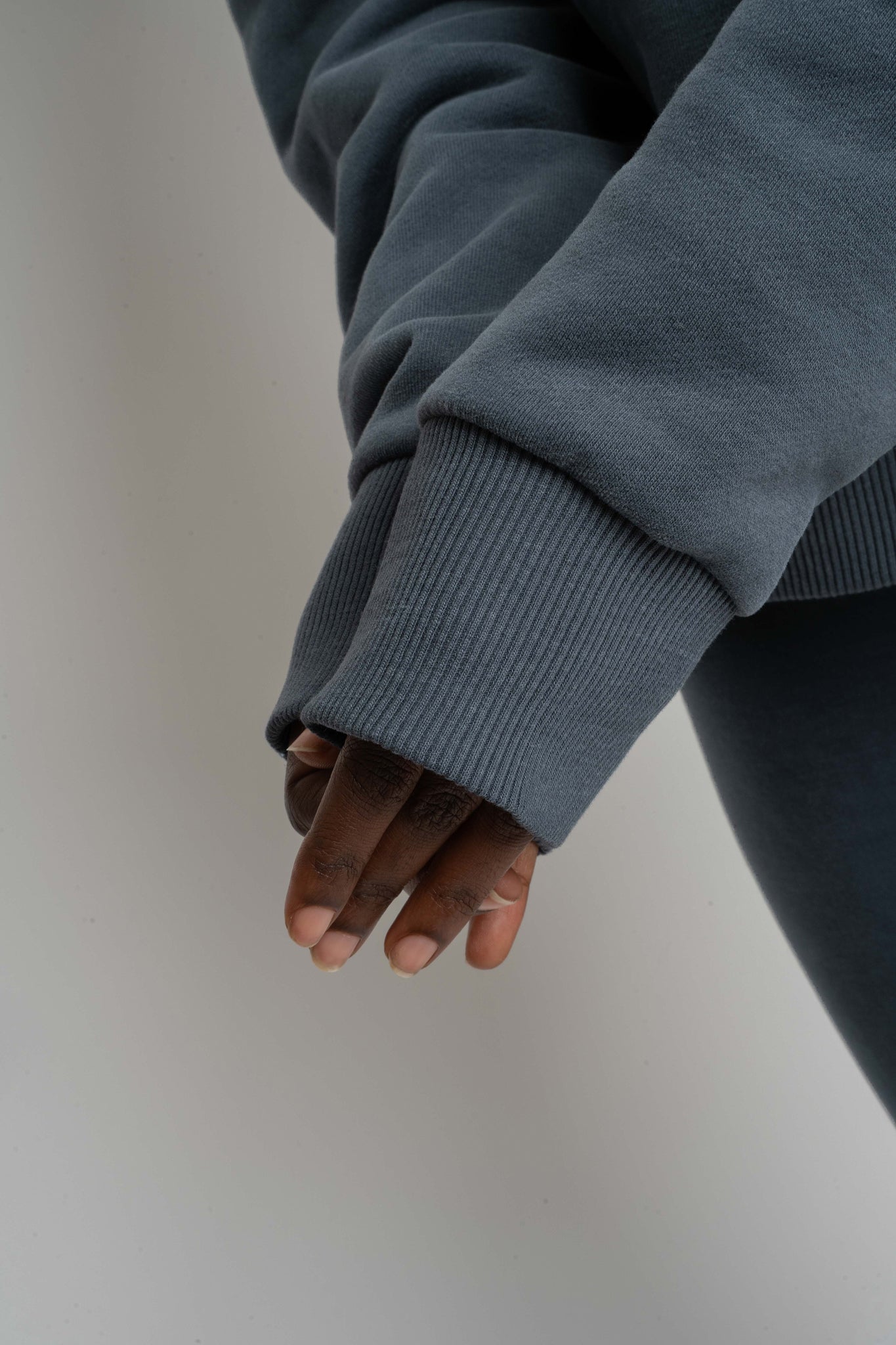 Bluza uszyta jest z naszej flagowej, grubej dzianiny, która nas wyróżnia. Jest ona gładka, ale przy tym bardzo mięsista. Od spodu posiada charakterystyczny splot diagonalny pokryty lekkim meszkiem, który w przyjemny sposób otula naszą skórę.