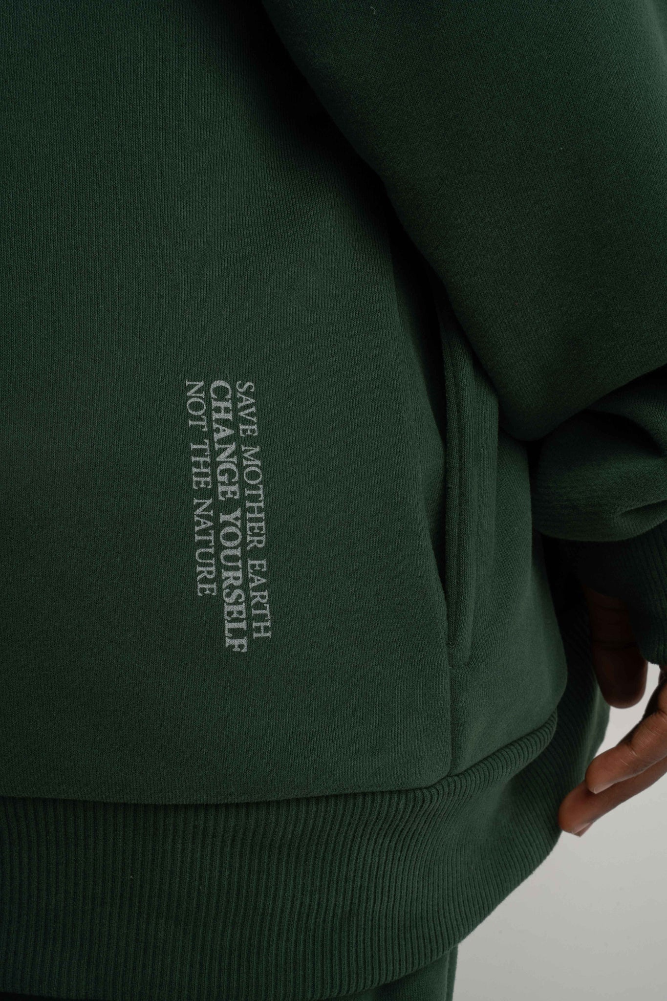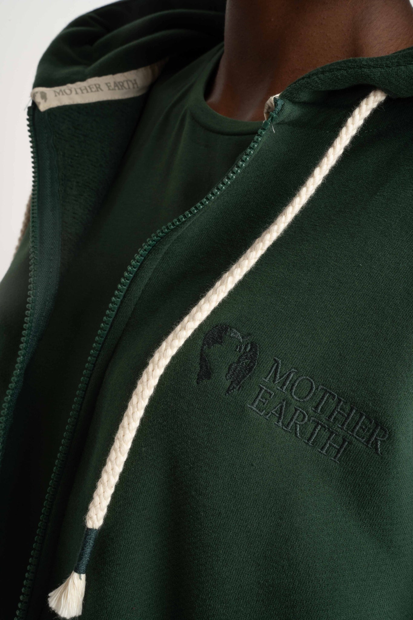 Minimalistyczne detale, takie jak subtelny haft z logo „Mother Earth" z przodu i drobny nadruk z tyłu z hasłem „SAVE MOTHER EARTH, CHANGE YOURSELF NOT THE NATURE", to ukłon w stronę świadomych wyborów i odpowiedzialnej mody.