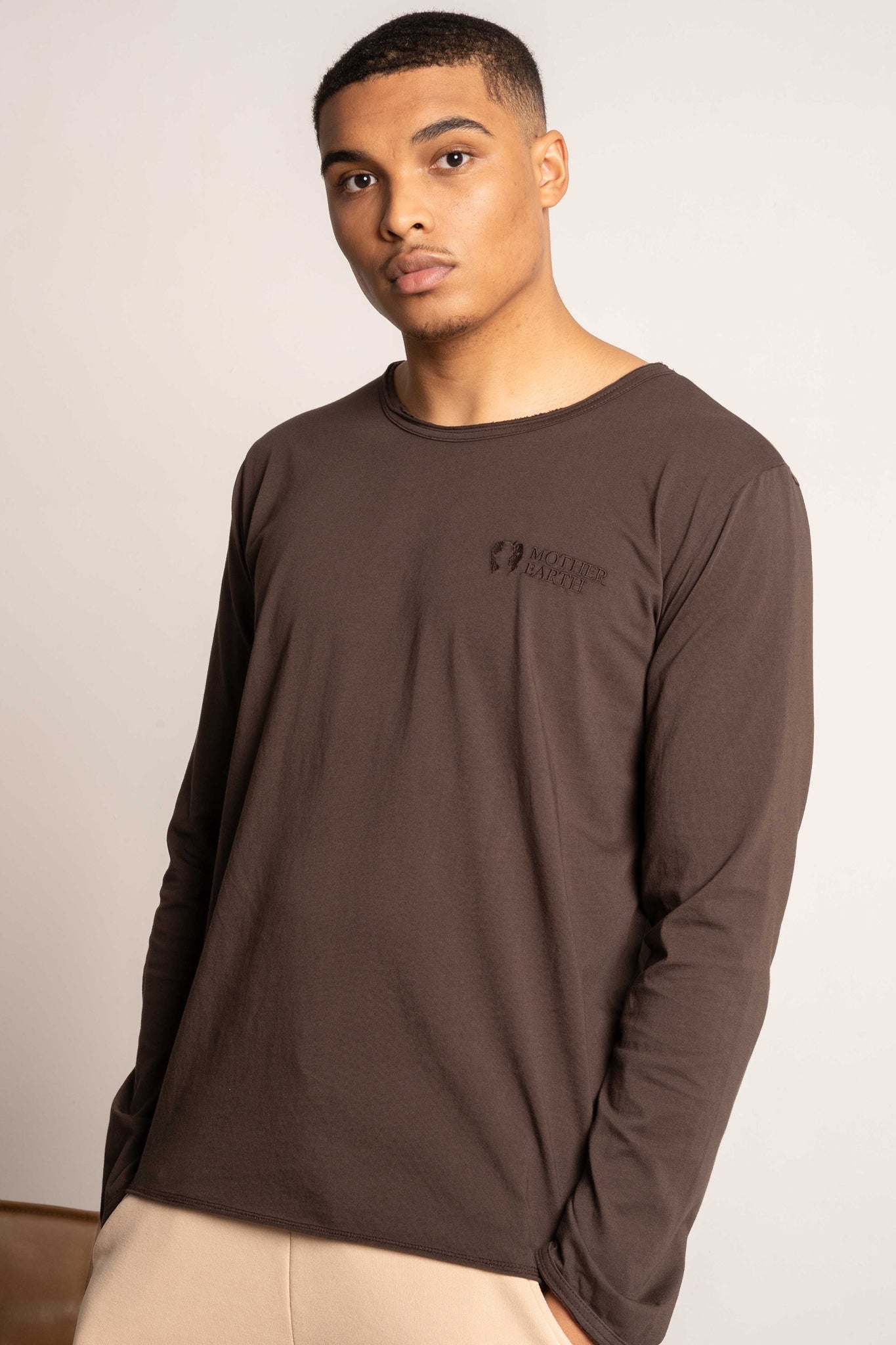 Minimalistyczny haft z logo na klatce piersiowej dodaje całości nowoczesnej, stonowanej elegancji, podkreślając charakter produktu. Okrągły dekolt oraz surowe wykończenie nadają koszulce casualowego, lifestylowego stylu, idealnego do codziennych stylizacji.